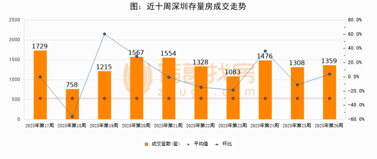 存量房方面,第26周深圳存量房成交1359套,较上周增加51套,环比上涨3.9%。从近十周成交走势来看,周均成交套数为1337套,本周高于平均水平1.6%。