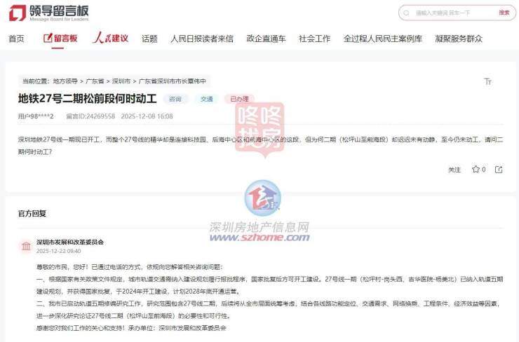 近日,有市民在领导留言板咨询27号线二期松前段(松坪山至前海段)的开工时间,指出该段线路连接科技园、后海中心区和前海中心区,是整条线的“精华”,为何至今尚未动工?