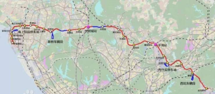 线路西起大空港,经沙井、光明城枢纽、观澜、平湖枢纽、横岗,东至盐田路,全长约63公里。