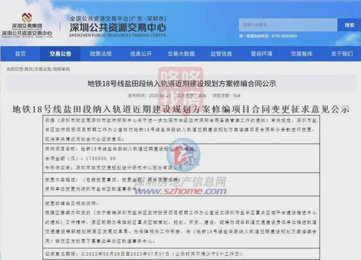 今年6月,深圳公共资源交易中心发布《18号线盐田段纳入轨道近期建设规划方案修编项目合同变更征求意见公示》。