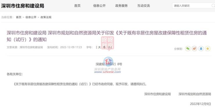 12月9日,深圳市住房和建设局、深圳市规划和自然资源局印发《关于既有非居住房屋改建保障性租赁住房的通知(试行)》(以下简称通知)。