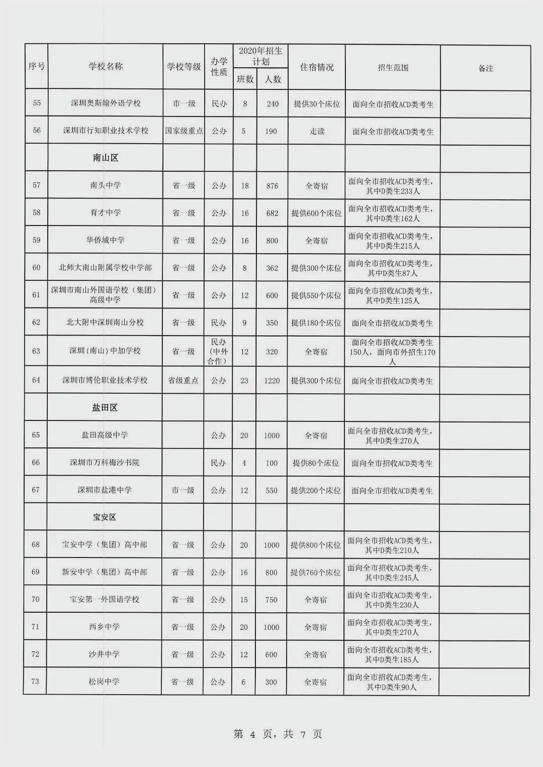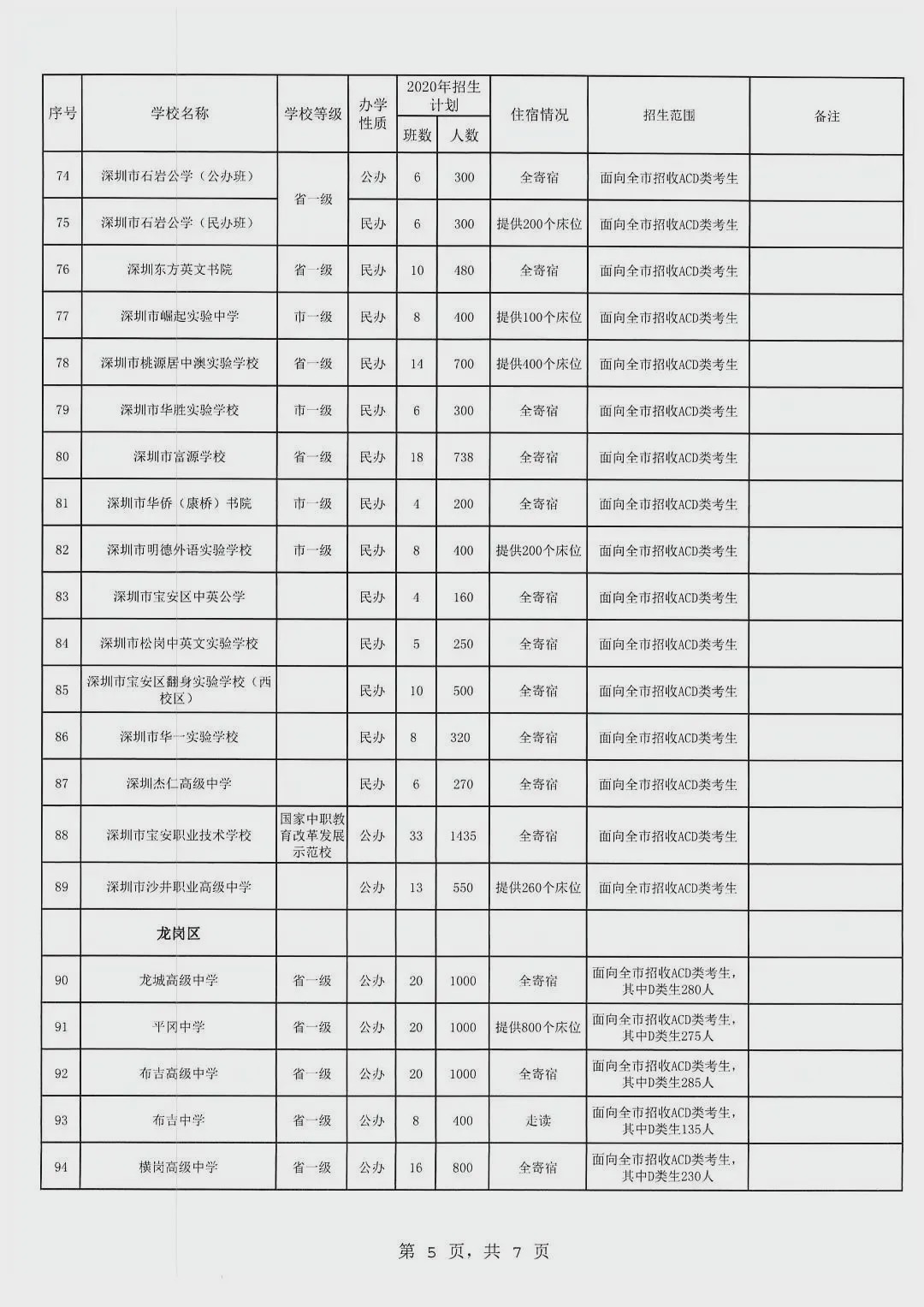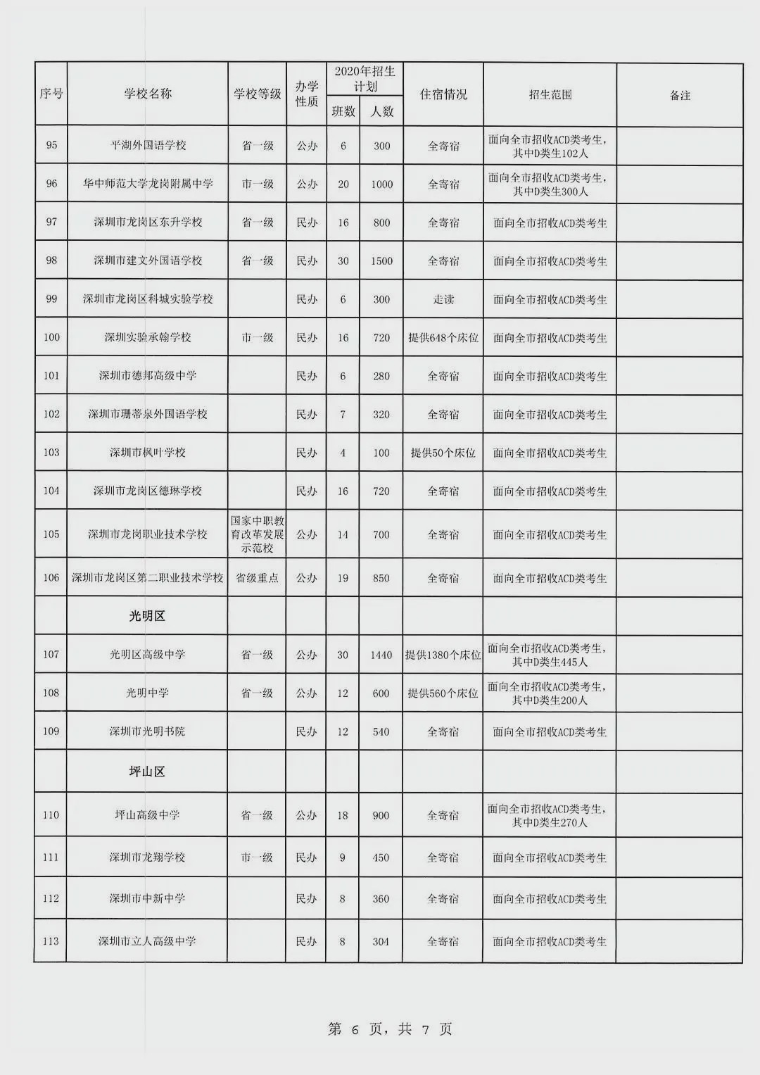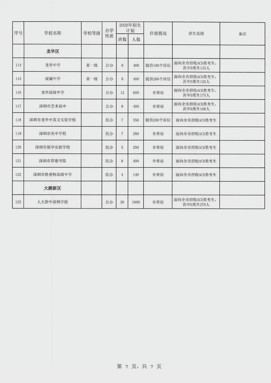 深圳外国语学校今年招收19个班,招生人数798人,面向深圳招收ACD类考生,其中D类考生95名,比2019年增加了一个班;深圳外国语学校龙华高中部,20个班,900人,全寄宿,面向深圳招收ACD类考生,其中D类考生245名。比2019年增加了2个班,招生名额也增加90人。