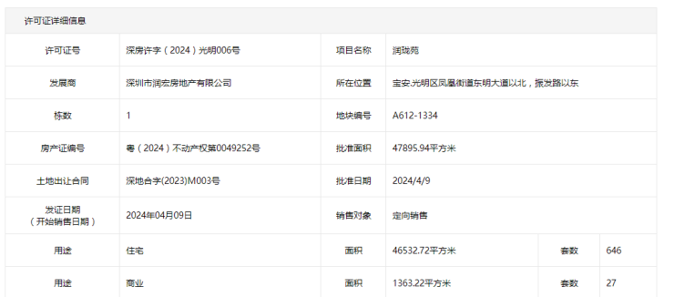 4月9日,深圳房地产信息平台公示润珑苑预售许可证,项目首批推出646套房源,房源位于4栋。据悉,本批将配售81套建面约89㎡的三房、565套建面约69㎡的两房,整体备案均价23810.55元/平(含简装)。