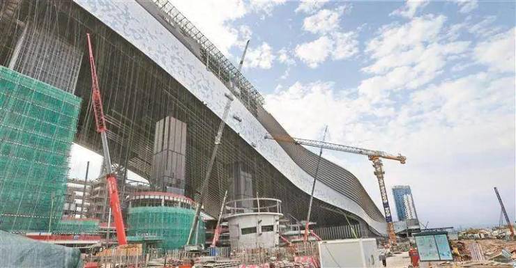 配套设施同样亮眼:4.9万平方米的JW万豪酒店进度稳步推进,精装基层施工正如火如荼。未来352间客房将配备宴会厅、泳池、SPA等完善设施,玩累了就能直接入住。