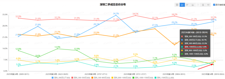 乐有家研究中心公开数据也显示,过去一周,深圳1500万以上高端改善房源成交占比大幅提升,占比5.6%,上涨3.1个百分点,达到7月以来的新高。