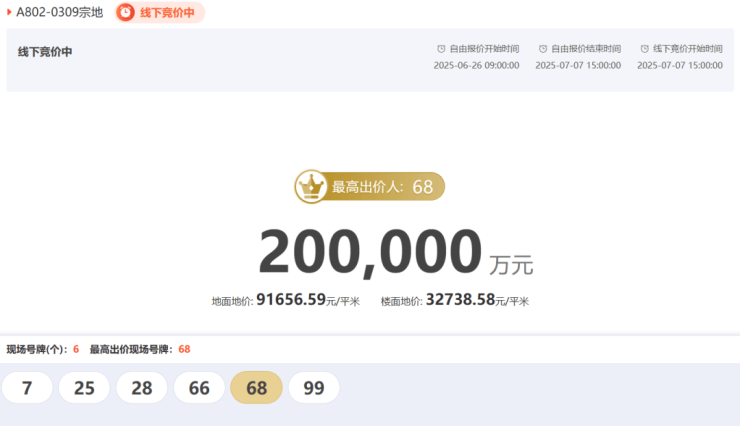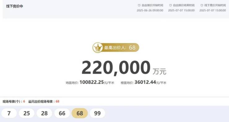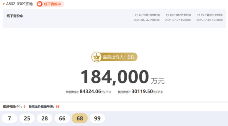 第36轮报价,68号中海加价1000万,直接把楼面地价推上了“3字头”,此时竞拍总价也去到了18.4亿。