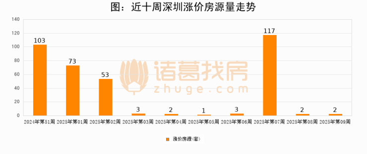 从调价房源来看,第9周深圳涨价房源2套,较上周持平。与此同时,9周涨价房源占比回落1.88个百分点,业主信心小幅波动,购房者可则需入市。