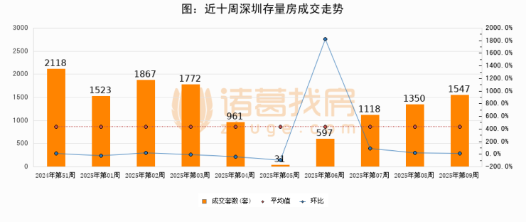 存量房方面,第09周深圳存量房成交1547套,较上周增加197套,环比上涨14.6%。从近十周成交走势来看,周均成交套数为1288套,本周高于平均水平20.1%。