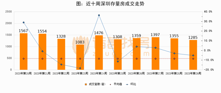 存量房方面,第29周深圳存量房成交1285套,较上周减少70套,环比下降5.2%。从近十周成交走势来看,周均成交套数为1371套,本周低于平均水平6.3%。