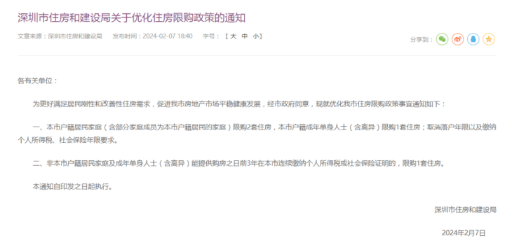 深圳住建局发布优化住房限购政策通知。其中,深户购房取消落户年限以及缴纳个人所得税、社会保险年限要求;非深户购房由连续缴纳5年的个人所得税或社会保险证明改为3年。