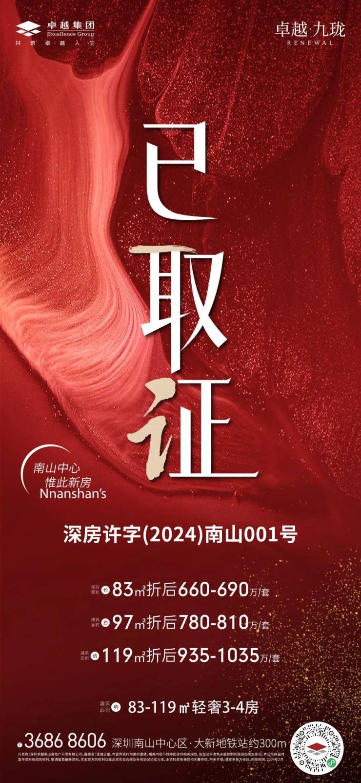 日前,2024南山001号、核芯热门红盘卓越九珑(备案名:珑瀚公馆)取证了!将于2月25日盛大开盘!