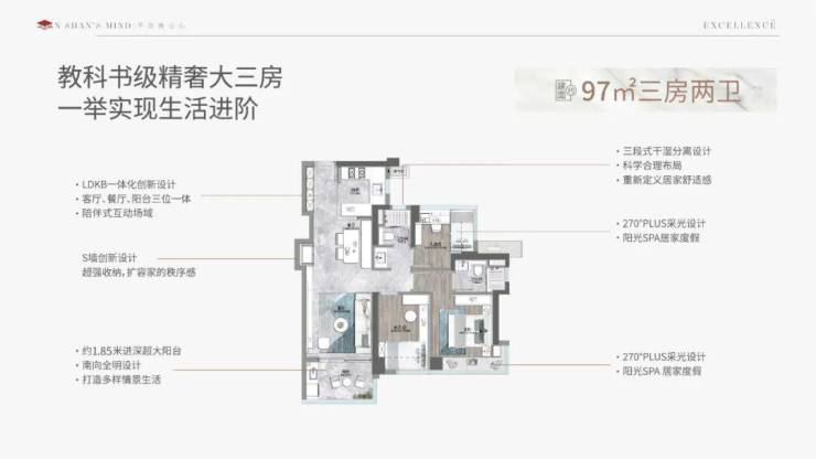 如果预算相对充裕,想要一步到位实现精奢生活,这套建面约97㎡的三房两卫值得拥有。