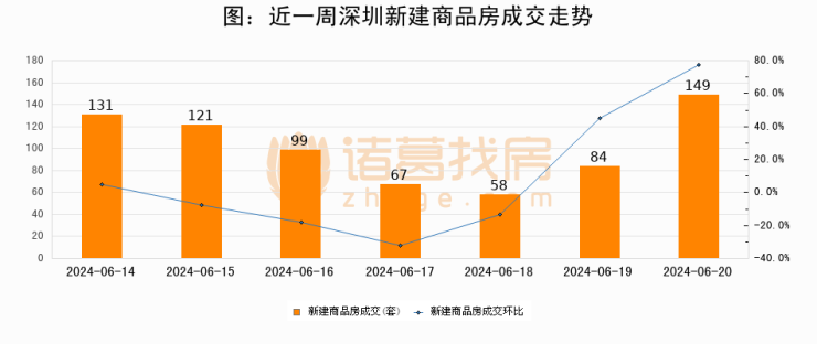 根据深圳市住房和城乡建设局数据显示,2024年06月20日深圳新建商品房成交149套,较昨日增加65套,环比上涨77.4%