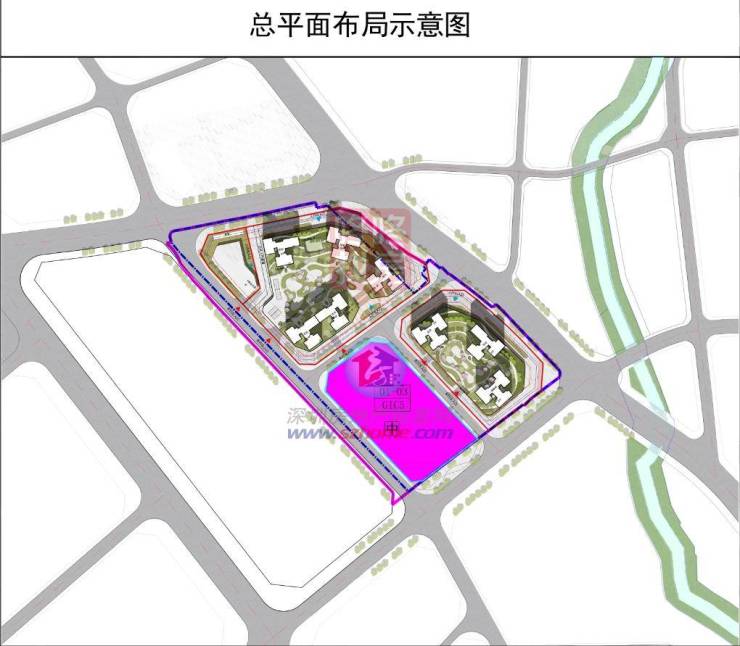 据规划平面布局图显示 ,项目由5栋40层以上高层住宅,1栋政府配租的保障性住房,1栋41层高的办公写字档,1所12班幼儿园组成。项目含一所18班小学。