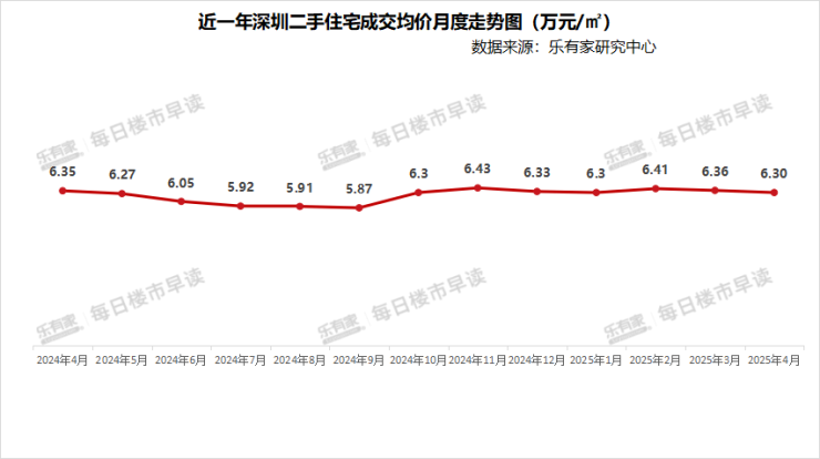 根据乐有家门店成交数据计算,4月深圳二手成交价为6.30万元/㎡,环比小幅下降0.9%,但整体维稳,深圳二手住宅成交均价连续7个月稳定在6.3万元/㎡以上。