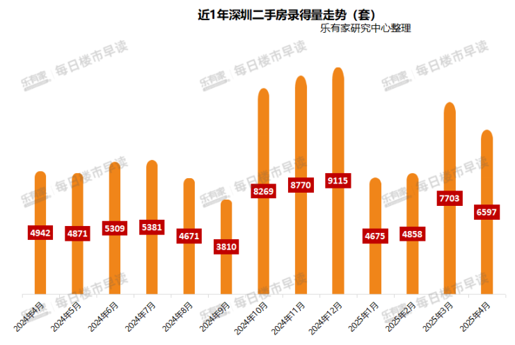 4月深圳二手房录得量为6597套,环比下降14.4%,同比增长33.5%,远超5000套荣枯线,处于相对高位。(注:最终录得量以深房中协月报为准)