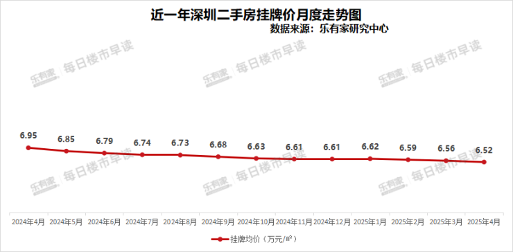 根据乐有家门店挂牌数据计算,4月深圳二手住宅挂牌均价为6.52万元/㎡,环比小幅下滑0.6%,整体维稳。