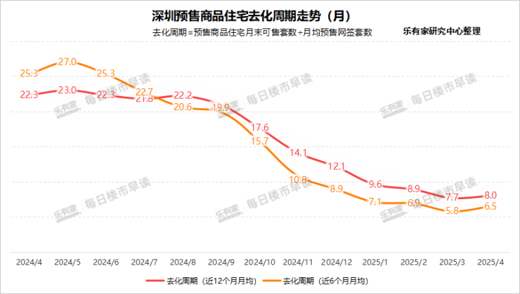 截止4月底,深圳一手预售住宅库存量为28062套,按近12个月一手预售住宅月均去化速度(月均3494套)计算,去化周期为8.0个月;按近6个月一手预售住宅去化速度(月均4332套)计算,去化周期为6.5个月。4月新增供应有所上涨,促使库存量和去化周期小幅提升,但整体仍处相对低位。