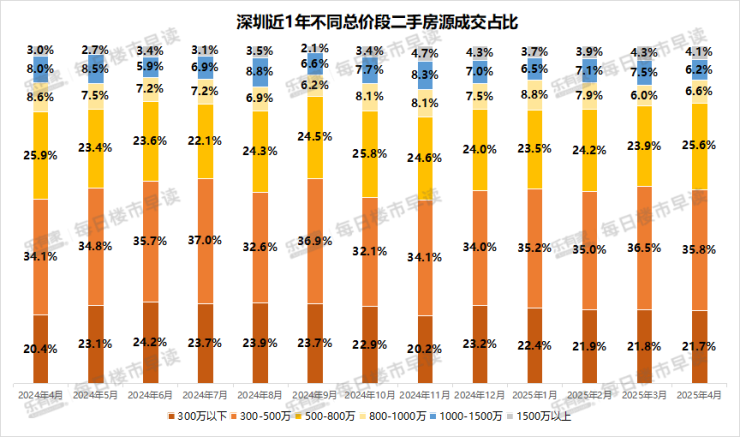 4、成交结构:500-800万刚改及800-1000万改善房源成交占比上涨,分别提升1.7、0.6个百分点