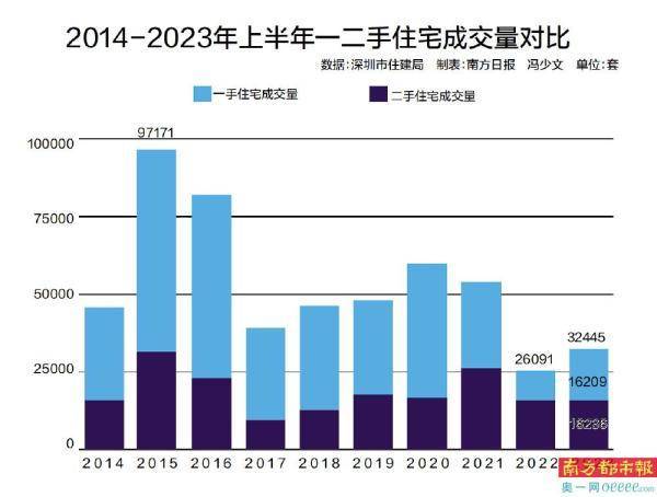 据深圳市住建局披露,南方+统计数据显示,2023年1-6月,深圳一、二手住宅合计成交32445套,比去年同期增加24.35%。具体来看,一手住宅成交16209套,同比增0.51%;二手住宅成交16236套,比去年同期大幅增加+62.93%。