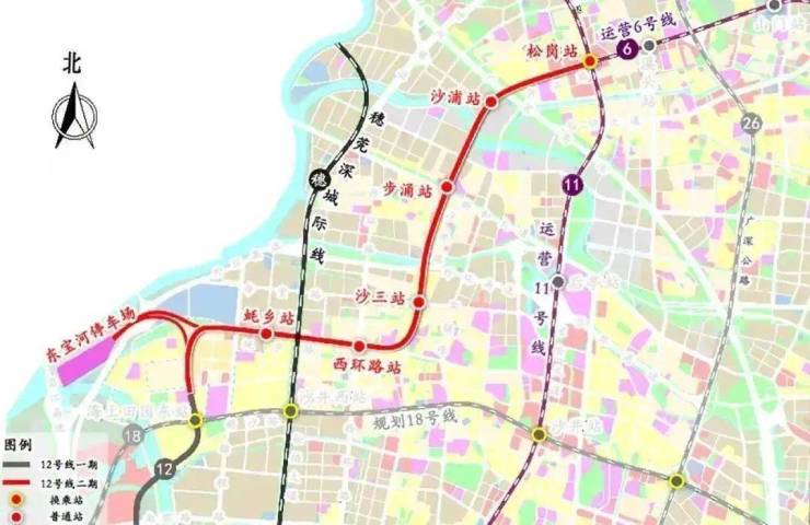 12号线二期工程由12号线一期工程终点海上田园东站引出,沿民主民丰路、蚝乡路、沙井路、沙江路敷设,终至松岗站 。
