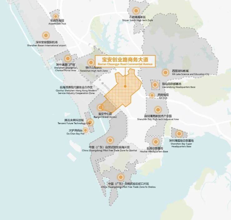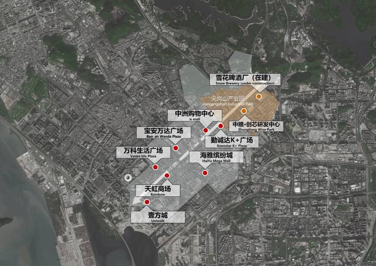 创业路商务大道沿线汇聚了壹方城、海雅缤纷城、中洲商业π mall等大型商业,紧邻宝安中心区、腾讯未来科技城、留仙洞总部基地等重大发展平台。