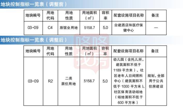 03-09地块用地性质为二类居住用地(R2),容积率为5.0,配套设施项目名称为“幼儿园(含托儿所,建筑面积不低于1189平方米)、社区老年人日间照料中心(建筑面积不低于1000平方米)、社区体育活动场地(场地面积不低于600平方米)”,备注为“规划,全部用于公共住房建设”。详见附件:调整前后地块控制指标一览表及附图。