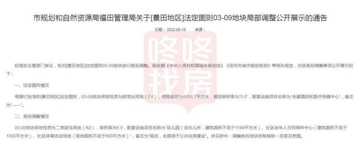 8月18日,深圳市规划和自然资源局福田管理局发布《关于[景田地区]法定图则03-09地块局部调整公开展示的通告》。