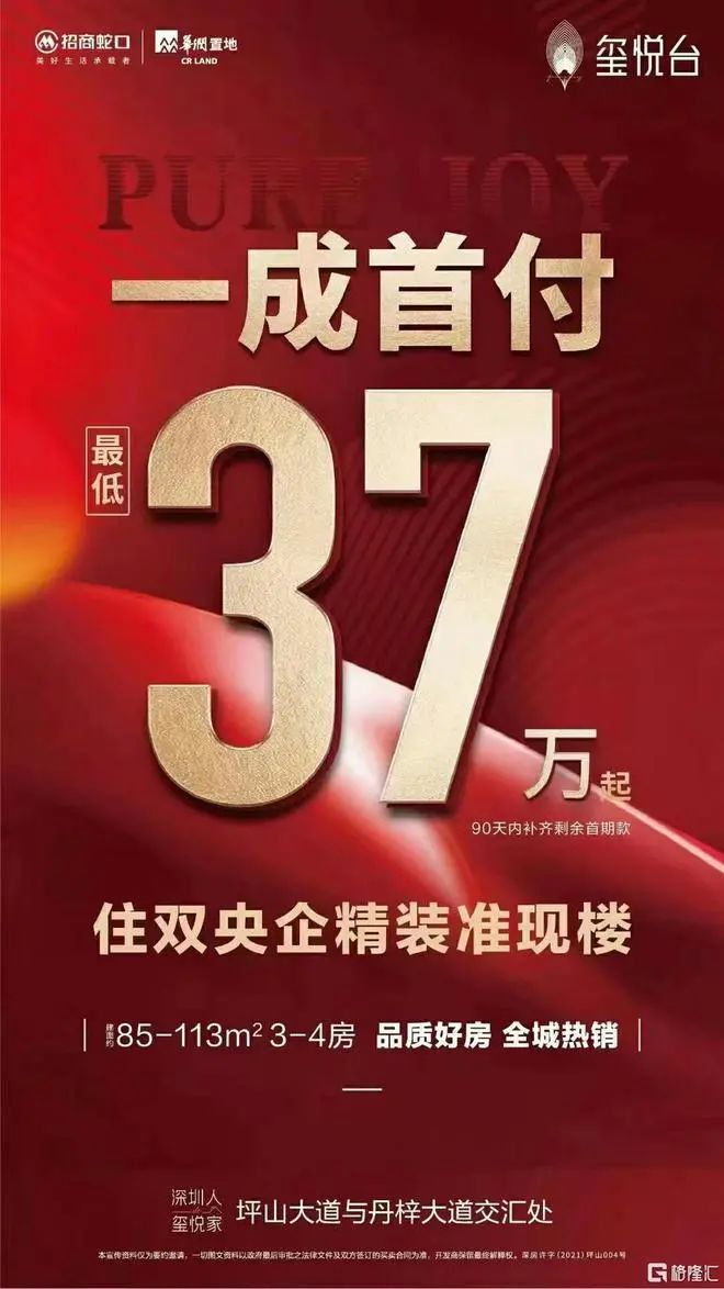 在深圳坪山区,一处在售新盘打出“一成首付较低37万起”的口号,这样的上车门槛几乎可以和三四线城市的首付相比。不过,如果仔细看相关广告,购房者会发现这只是开发商虚晃一枪的操作,因为在广告海报上还显示着一行字:“90天内补齐剩余首付款”。