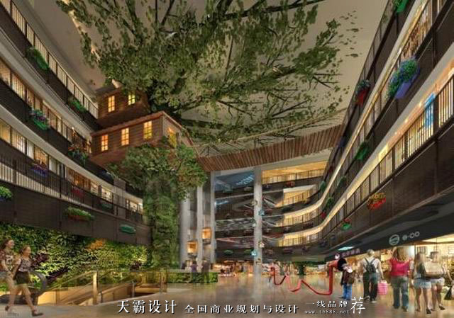 DDM mall中庭位置巨型仿真树,高达15米,是深圳购物中心内首次尝试在中庭打造大型类似的场景。仿真树下有绿色的小建筑,而树上则砌了个性化小木屋,木屋的一头通过空中廊桥与商场四楼相连,营造了一种高空浪漫氛围。从高层往下看,整个DDM mall中庭处于大树底下,弥漫着清新休闲的氛围。