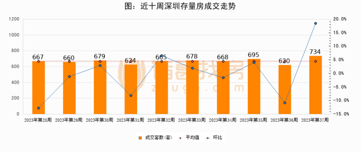 存量房方面,第37周深圳存量房成交734套,较上周增加114套,环比上涨18.4%。从近十周成交走势来看,周均成交套数为669套,本周高于平均水平9.7%。