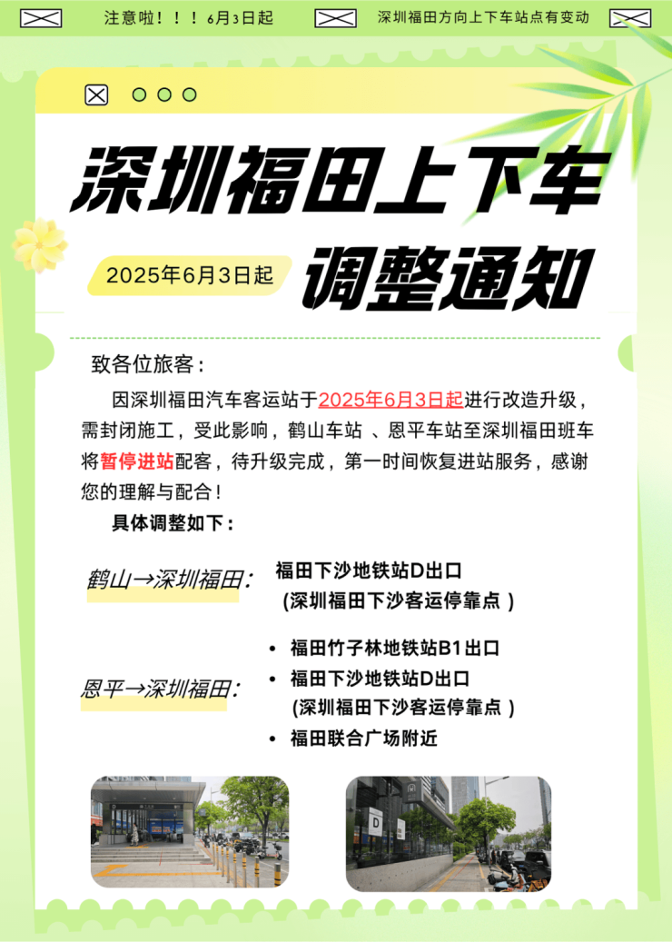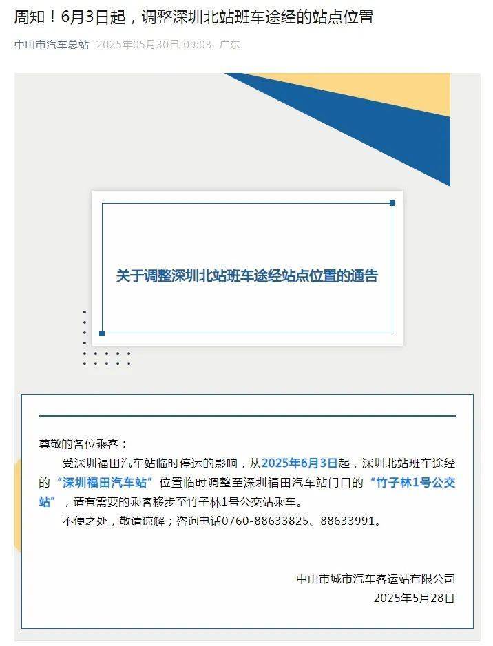 受深圳福田汽车站临时停运的影响,广东省内多个汽车客运站同时发布了调整途经站点位置的公告。