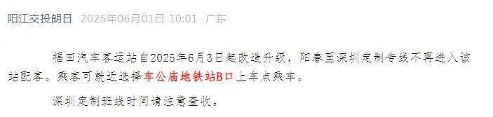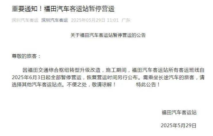 近日,福田汽车客运站发布公告称:因福田交通综合枢纽转型升级改造,施工期间,所有客运班线自2025年6月3日起全部暂停营运,恢复营运时间另行公布。