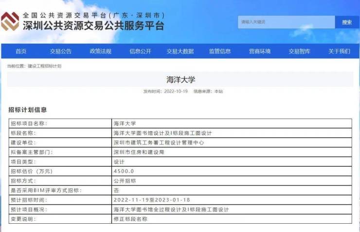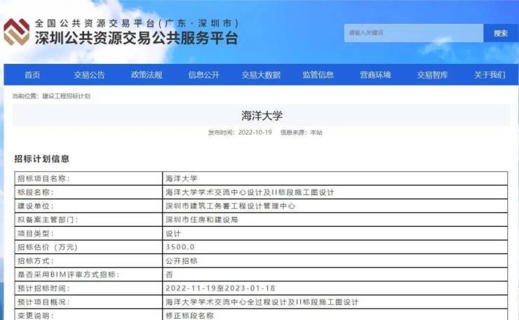 记者注意到,深圳公共资源交易中心也于近期对外公布《海洋大学图书馆设计及I标段施工图设计》《海洋大学学术交流中心设计及II标段施工图设计》两条招标计划信息,同时在10月13日还公布《海洋大学方案设计及初步设计》招标计划信息,这意味着深圳海洋大学建设正稳步推进中。