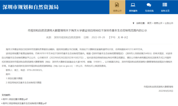 近日,深圳市规划和自然资源局发布《市规划和自然资源局大鹏管理局关于海洋大学建设项目用地位于深圳市基本生态控制线范围内的公示》。