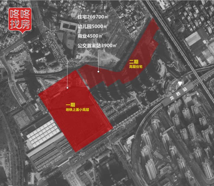 一期位于龙胜车辆段上盖,包括住宅、学校、幼儿园及其配套设施,建筑面积约12万平方米。