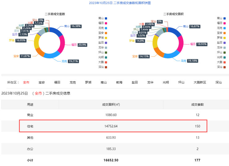 10月25日二手房住宅网签150套。宝安20套;福田31套;龙岗30套;罗湖25套;南山26套;盐田1套;龙华12套;光明2套;坪山1套;大鹏2套。