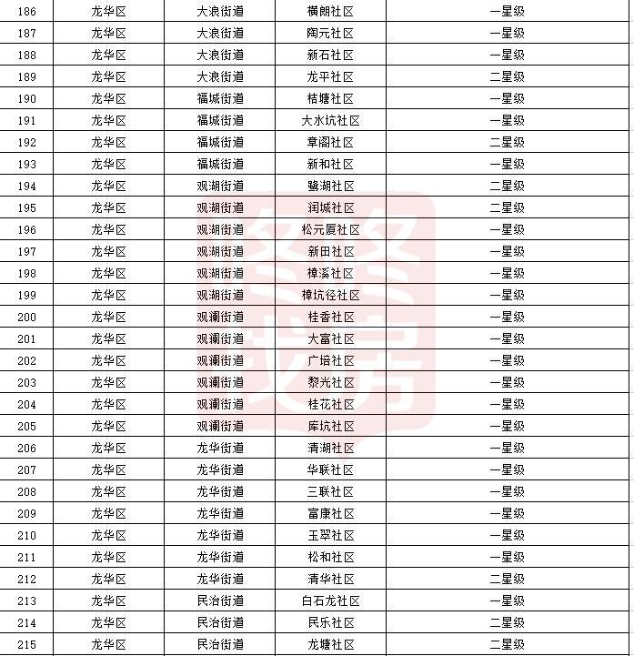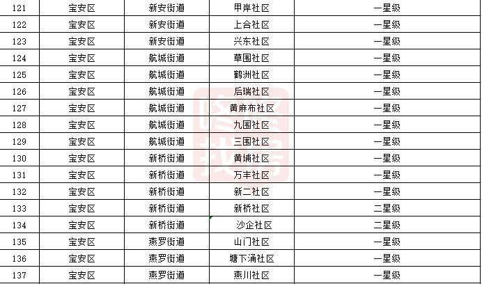 值得一提的是,如南山区粤海街道的蔚蓝海岸社区、宝安区西乡街道的桃园社区,龙岗区坂田街道的第五园社区和万科城社区等几个著名大型社区都拟认定为二星级社区。