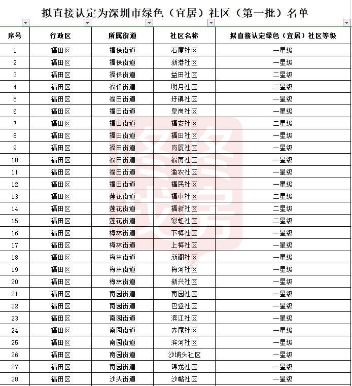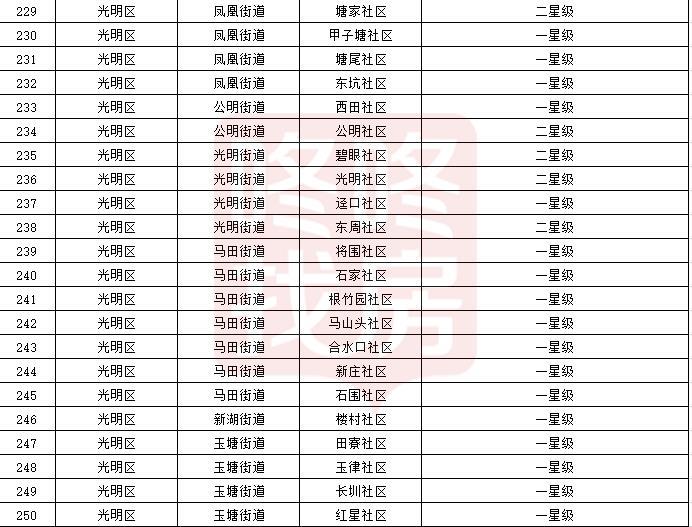 共22个社区入选,包括塘尾社区、公明社区、光明社区、红星社区等;