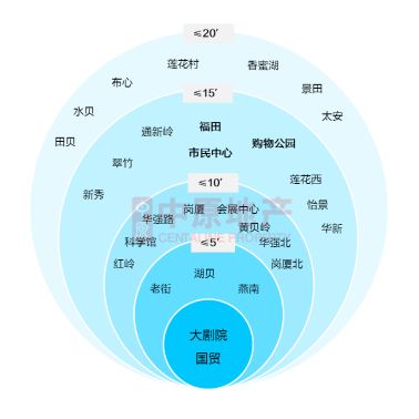 首先是福田CBD,在深圳地铁线路图上,福田站、市民中心站、会展中心站、购物公园站正好围成了一个圈,位于福田中心区的核心位置,此处聚集着众多高端写字楼,其半小时通勤圈内的岗厦片区、华强片区等也是企业集中的片区。