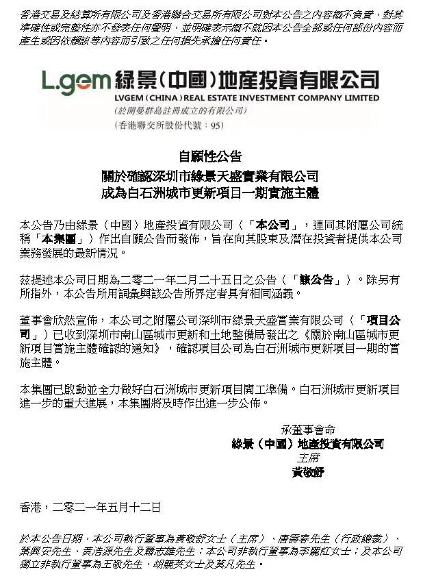 5月12日,绿景(中国)地产投资有限公司(简称“绿景中国”)发布公告称,其子公司深圳市绿景天盛实业有限公司成为深圳市南山区白石洲城市更新项目(即沙河五村城市更新单元项目)一期的实施主体。