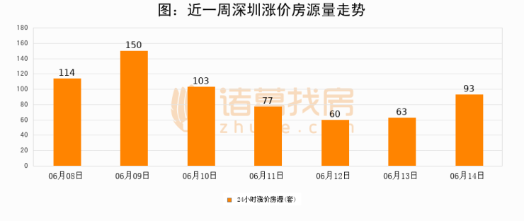 根据诸葛找房数据显示,深圳24小时涨价房源量为93套,较06月13日增加30套,环比上涨47.6%。与此同时,涨价房源占比小幅扩大,业主信心有所提升。