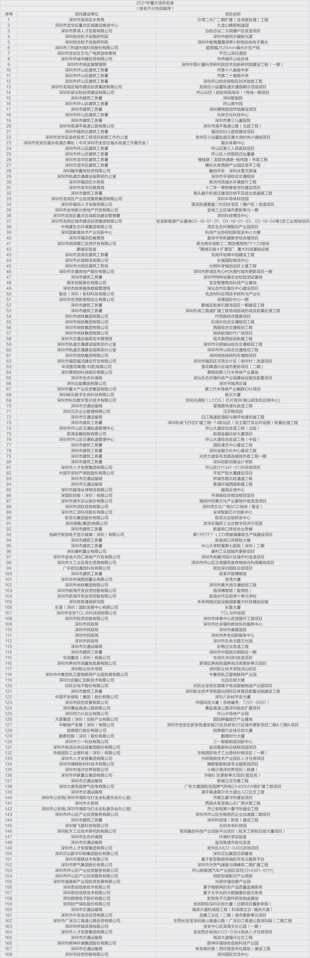 附:深圳市2021年重大项目计划清单