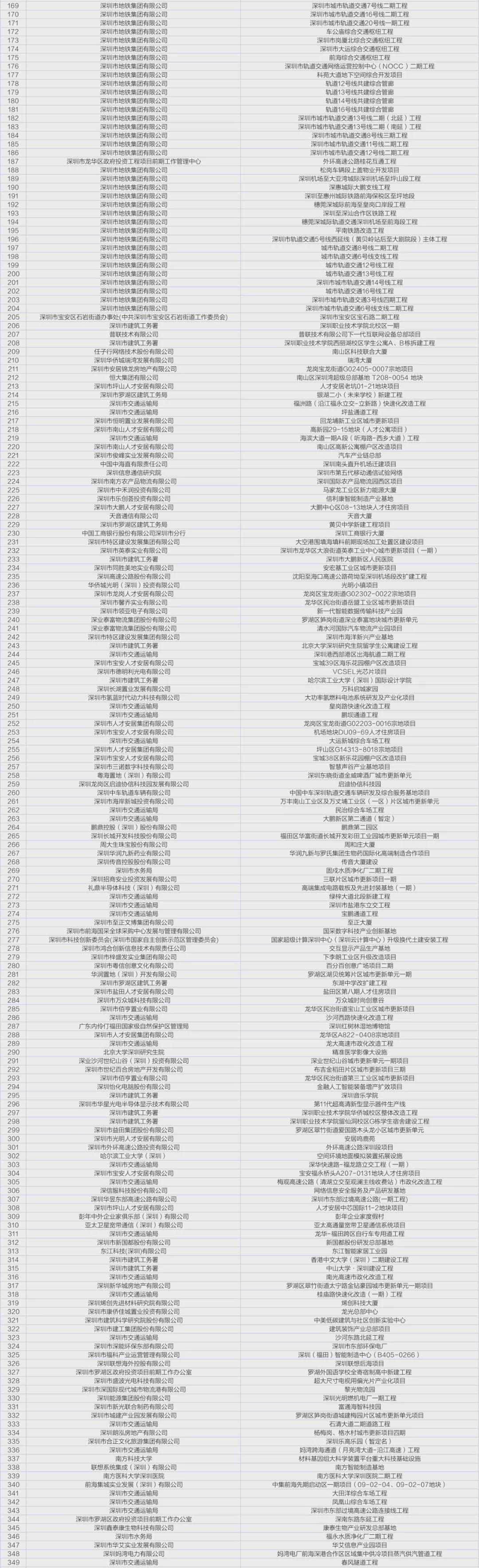 其中,深圳市地铁集团有限公司建设的重大项目30多个,包括西丽综合交通枢纽工程、深圳市城市轨道交通7号线二期工程、前海综合交通枢纽工程、深圳至深汕合作区铁路工程等。
