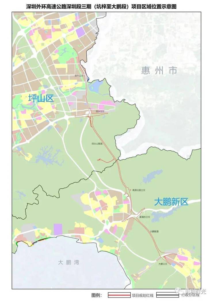 一、调整后的项目呈南北走向,路线全长约16.81公里。路线起于深圳市坪山区坑梓街道锦绣西路,与深圳外环高速公路二期工程顺接,采用高架桥形式与聚龙路平面共线,经坑梓、龙田、石井、葵涌、大鹏等街道,终于深圳市大鹏新区坪西快速路王母立交北侧,衔接坪西快速路及鹏飞路。