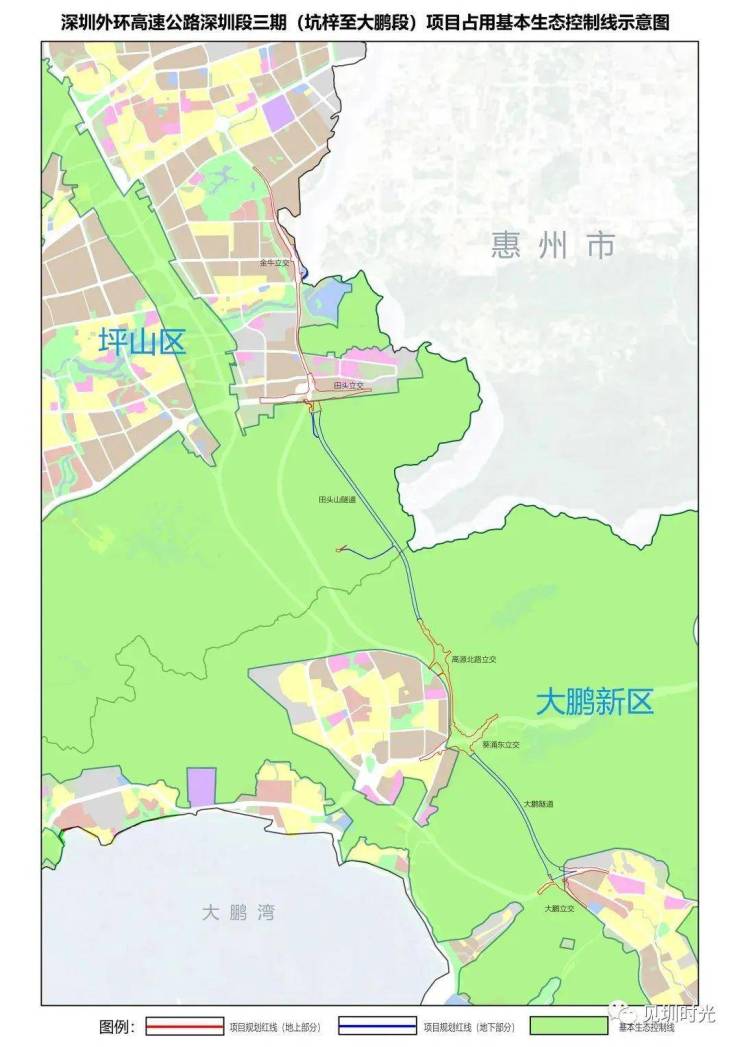 外环高速三期项目途经坪山区及大鹏新区2个区,线位穿过多处基本生态控制线范围,其中约11.77公里位于深圳市基本生态控制线内(示意图见附件2)。本项目属于“重大道路交通设施”,根据《深圳市基本生态控制线管理规定》第十条规定,重大道路交通设施可在基本生态控制线范围内建设。