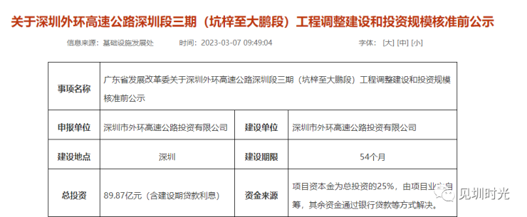 近日,广东省发展改革委基础设施发展处正式发布关于深圳外环高速公路深圳段三期(坑梓至大鹏段)工程调整建设和投资规模核准前公示。总投资89.87亿元(含建设期贷款利息),意味着项目将进入获批建设阶段。