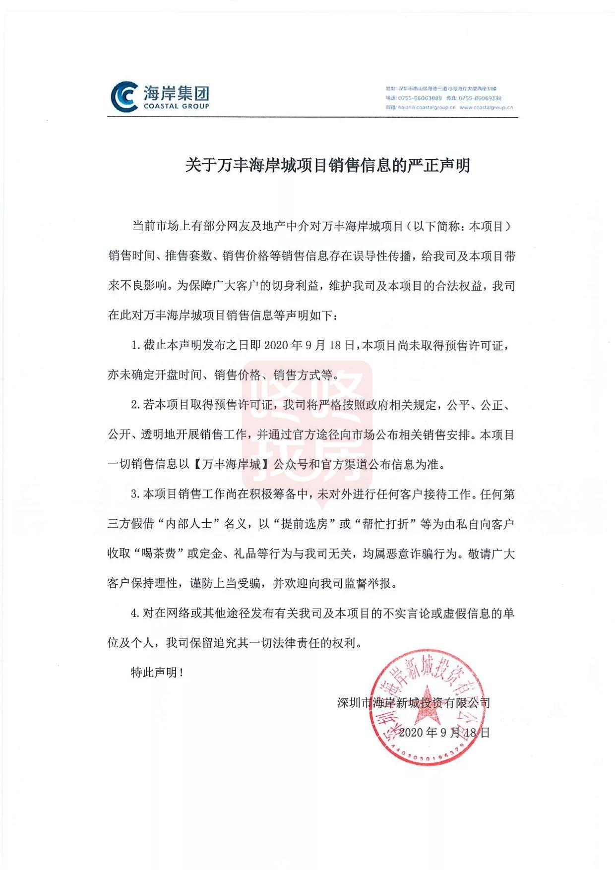 针对沙井万丰海岸城项目的传闻,万丰海岸城只在9月22日通过公众号曾发布声明回应:称当前市场上有部分网友及地产中介对万丰海岸城项目销售时间、推售套数、销售价格等销售信息存在误导性传播。项目尚未取得预售许可证,亦未确定开盘时间、销售价格、销售方式等。