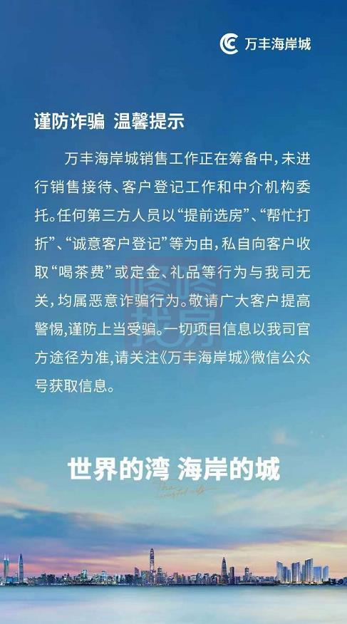 任何第三方人员以“提前选房”、“帮忙打折”、“诚意客户登记”等为由,私自向客户收取“喝茶费”或定金、礼品等行为与海岸城无关,均属恶意诈骗行为,敬请广大客户提高警惕,谨防上当受骗。