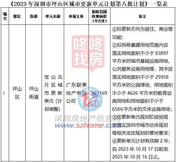 《2023年深圳市坪山区城市更新单元计划第八批计划包含一个项目,为宝山北片区城市更新单元(计划调整),位于坪山区坪山街道,申报主体广东联泰地产有限公司,拆除范围用地面积181169平方米。